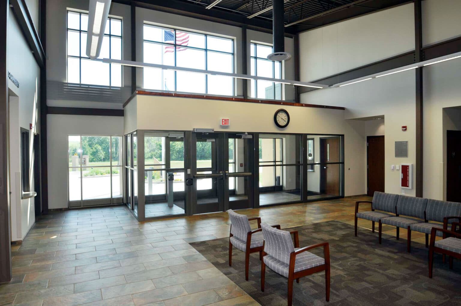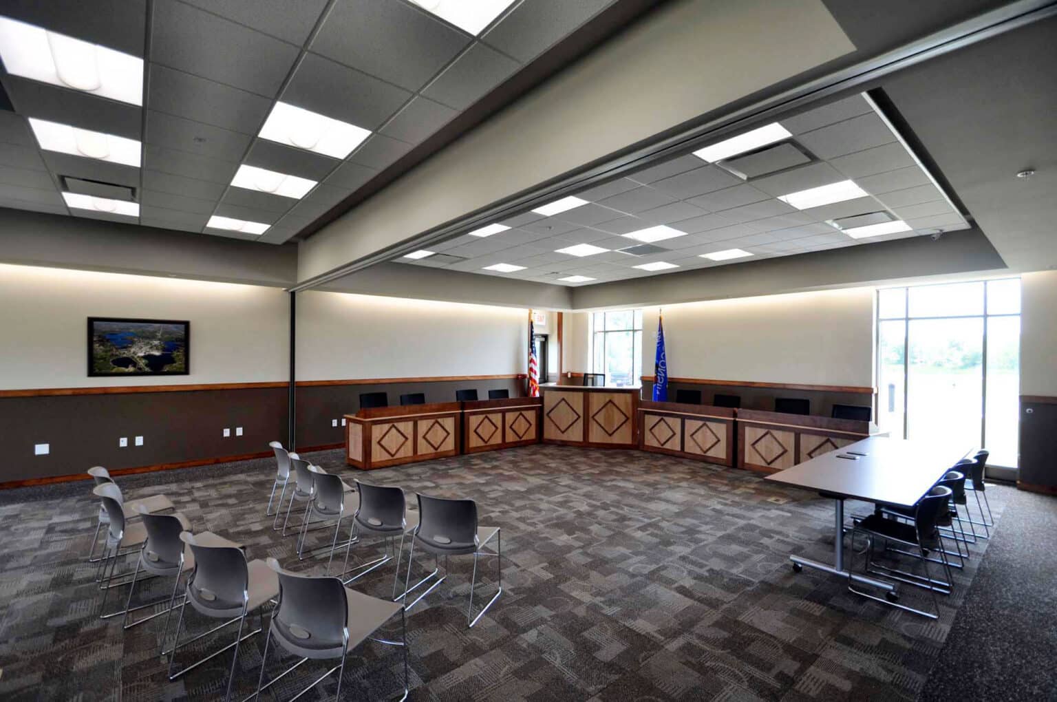 The 7,880 square foot facility included a curved glass panel entry way, which visually “invites” the visitor into the building, covered by an elliptical canopy. Upon entering the common lobby area, which can also function as an after hour meeting space or be used for other public functions, the visitor may proceed forward to City Hall, right to the Council Chambers or Court Room or go to the left for the Police Department. Each has a service window opening into the lobby area to help the visitor without the need to enter directly into the office spaces. The public restrooms also are accessed from the lobby area. The Council Chambers and Municipal Court areas are actually one large space which will normally be divided by a moveable partition wall. This wall can be retracted for large meeting requirements or left in place so that the City Council and Court areas can function simultaneously for different purposes. The City Hall area includes offices and workstations for the officials and staff as well as a secure records vault, copier/work space area, storage/supply rooms and a small staff break/conference area. The Police Department has an office for the Chief, officer work spaces, secure evidence locker, a non-secure storage room, its own restroom facility, locker room and shower and an indoor garage/sallyport which offers direct access to the secure arrest and booking area and interrogation room. An outside carport area provides space for the off-duty police vehicles.