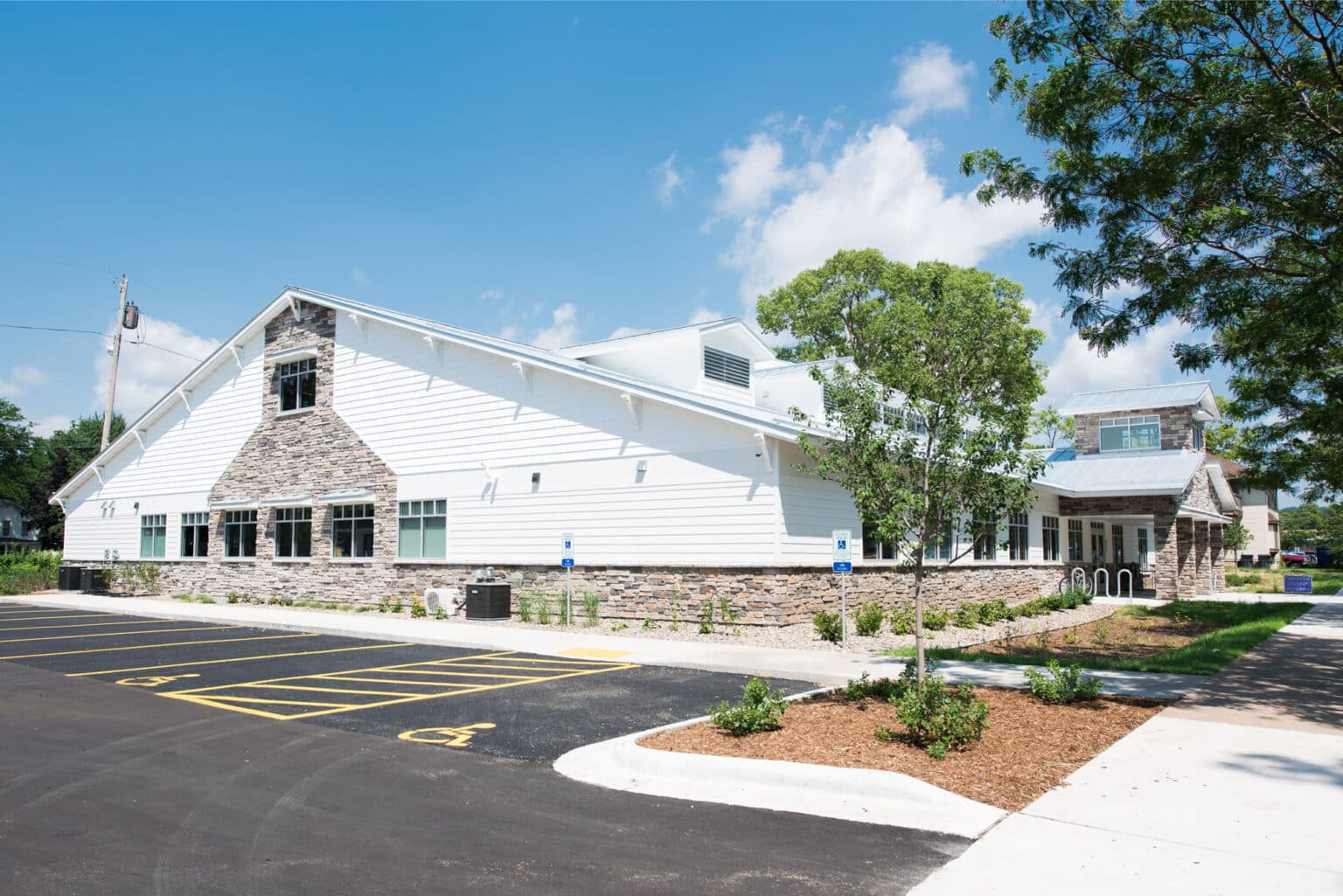 HSR Associates designed the new Coulee Recovery Center, a one-story wood-framed facility featuring a pitched metal roof and a welcoming front porch. The project includes comprehensive sitework, an outdoor patio, a receiving and trash area, and parking for up to 44 vehicles. Interior spaces were planned to support a wide range of activities, including front and rear vestibules, a reception area with mail/copy room, a TV/game room, a large meeting room, coffee/lobby area, kitchen with storage, arts and crafts room, resource center/library, meditation/multi-purpose room, two conference/classrooms, eight private offices, and four open office workstations.