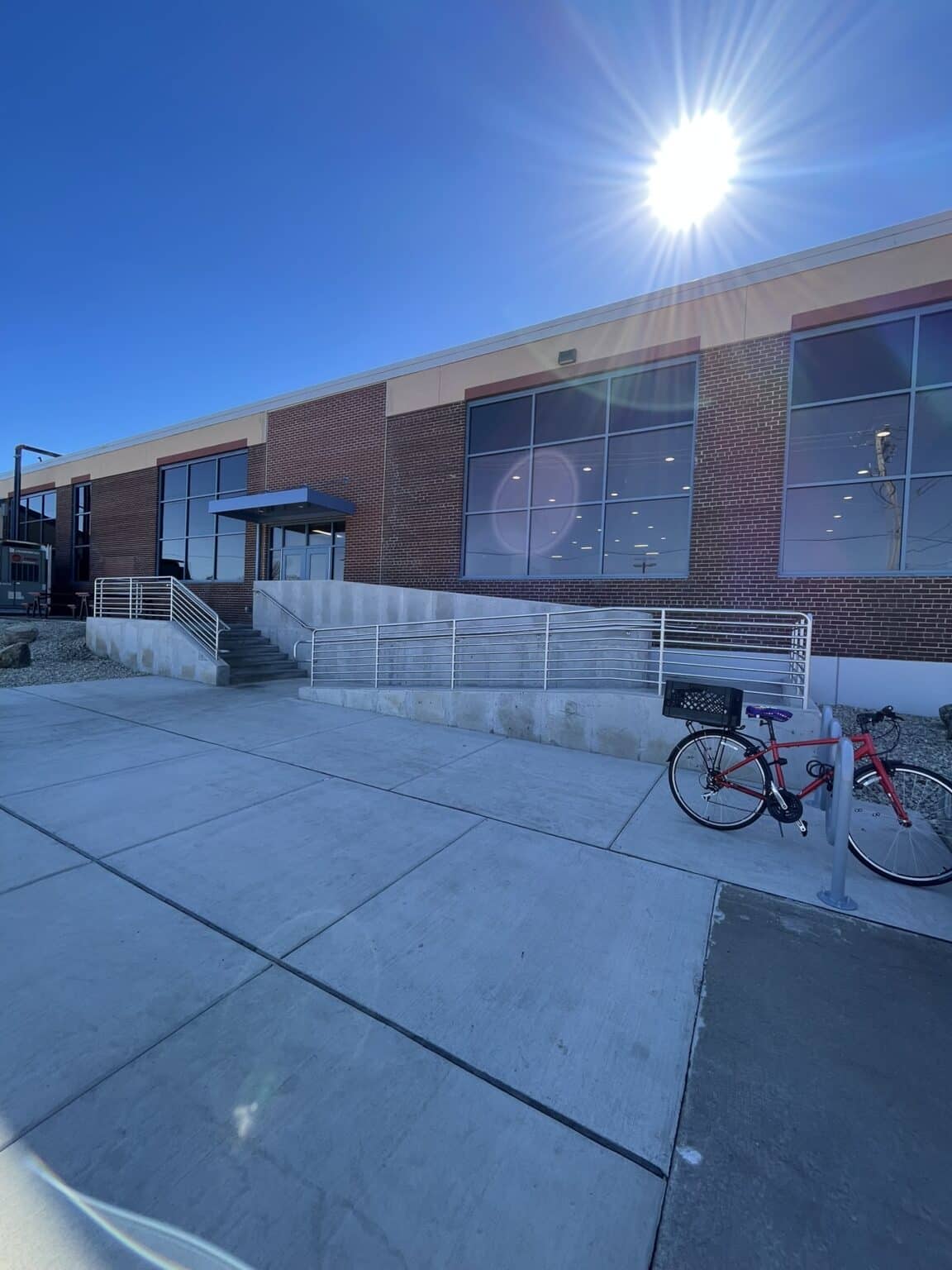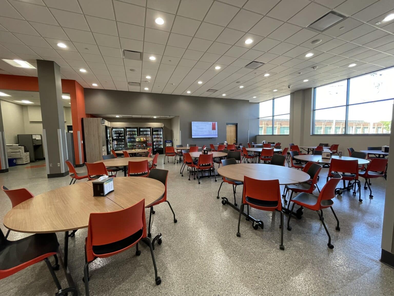 HSR worked with Trane Company to update the employee breakroom area and entry at Plant 4 in La Crosse, WI on Townsend St. The project transformed an underutilized corner of Plant 4 into a bright updated breakroom area for employees. Old windows were replaced with new energy efficient frames to increase the amount of daylight coming into the space. Taking advantage of the height inside the plant, allowed for higher ceilings in the break area. The space included a new vending area with access to new employee locker rooms and restrooms without having to put on personal protective equipment and walk through the plant. As part of the project, we designed a new entry with stairs and ramp to accessibility for all employees and visitors. The entry sequence also includes required levels of security for employees coming and going from the plant with new turnstiles. The new space accommodates larger employee shift meetings or just a few people for lunch.